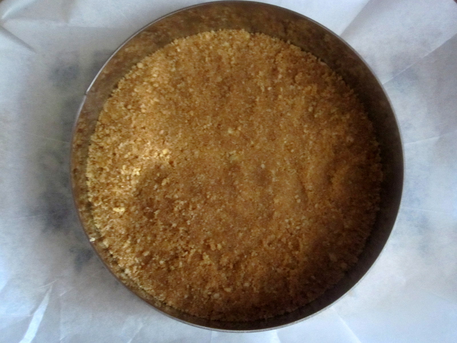 A vajat megolvasztottam, a kekszet ledaráltam és összekevertem, majd ezt az elegyet szépen egyenletesen belenyomkodjuk a karika aljába.